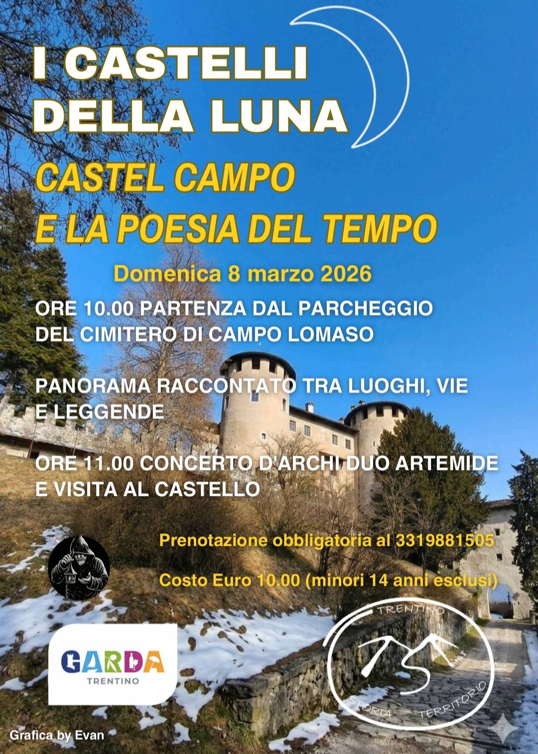 Da Campo Lomaso, col suo convento, a Castel Campo attraverso vicende e leggende con FraTerno. Gli spazi stupendi del maniero poi vissuti con la 🪉 musica 🪉 del duo Artemide.